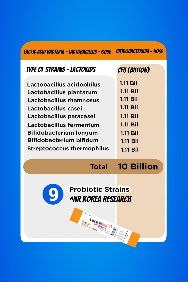 Lactokids + is specially formulated for infants and kids. It has 10 billion active probiotics to boost your child's immunity and build a strong digestive system. It is GMP (Good Manufacturer's Practice) certified by KFDA (Korea Food and Drug Administration). It has the World's First and only Double Microencapsulation by NR Korea patented technology which assures Over 90% of the probiotics enters the gut and achieves a very high survivability rate. Lactokids + is proven and backed by extensive and credible clinical trials.